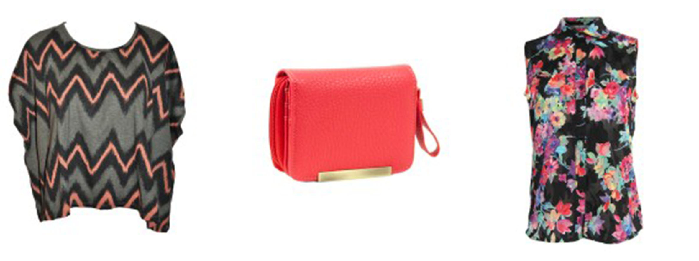 Zig zag print top, £39, Ruby Rocks; Vegan boxy wallet, £22, Misscogirl; Floral sleeveless shirt, £55, Komodo